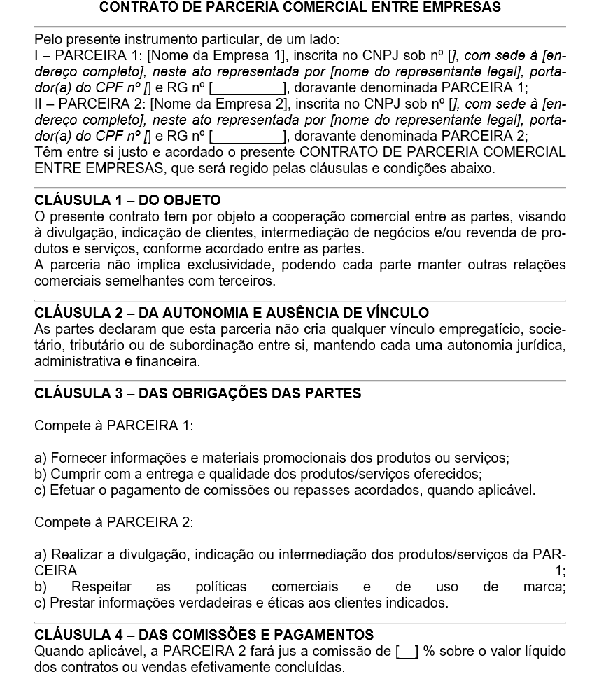 Definição do objeto da parceria (indicação de clientes, divulgação, revenda, etc.).