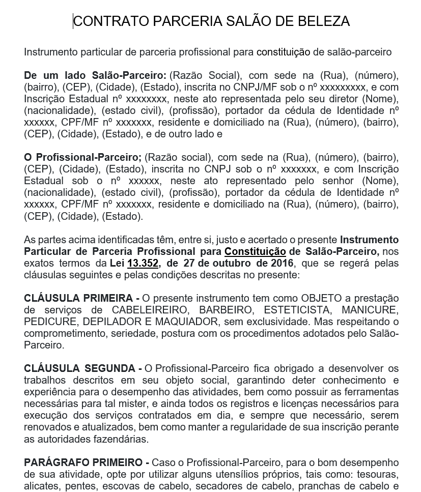 Partes e qualificação: salão e profissional (CPF/CNPJ, endereço, contatos).